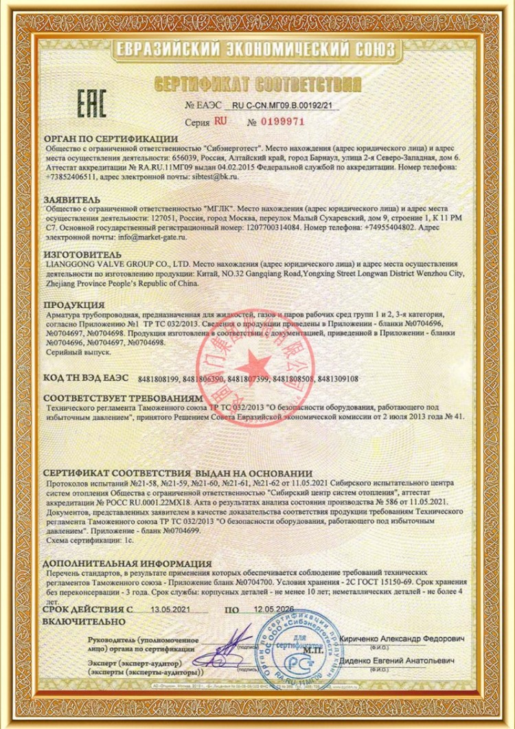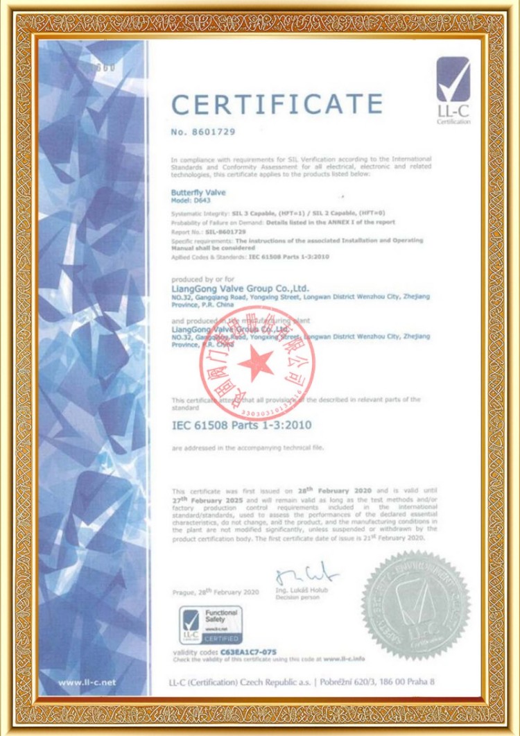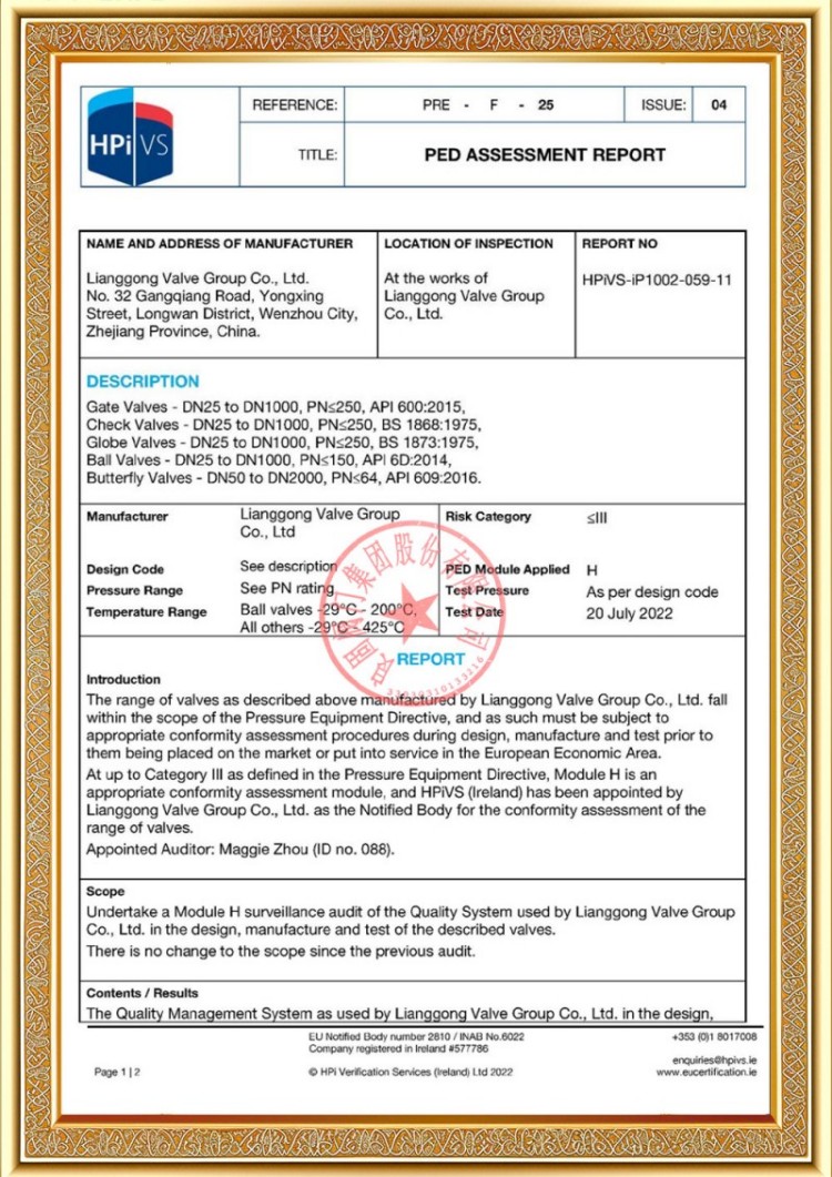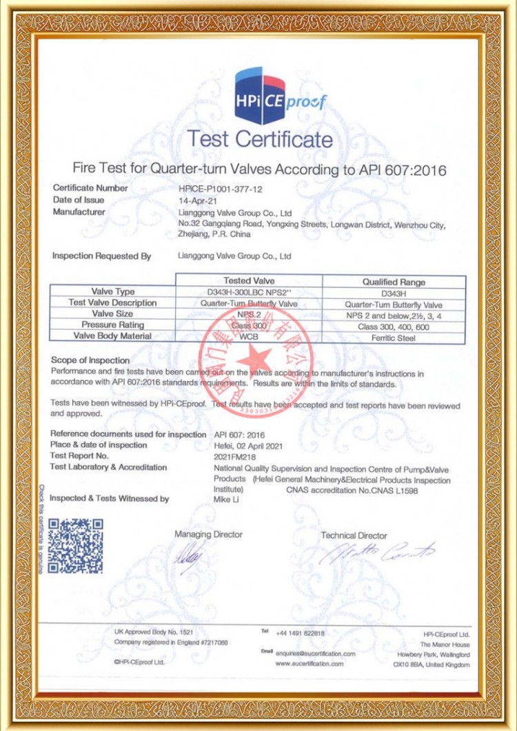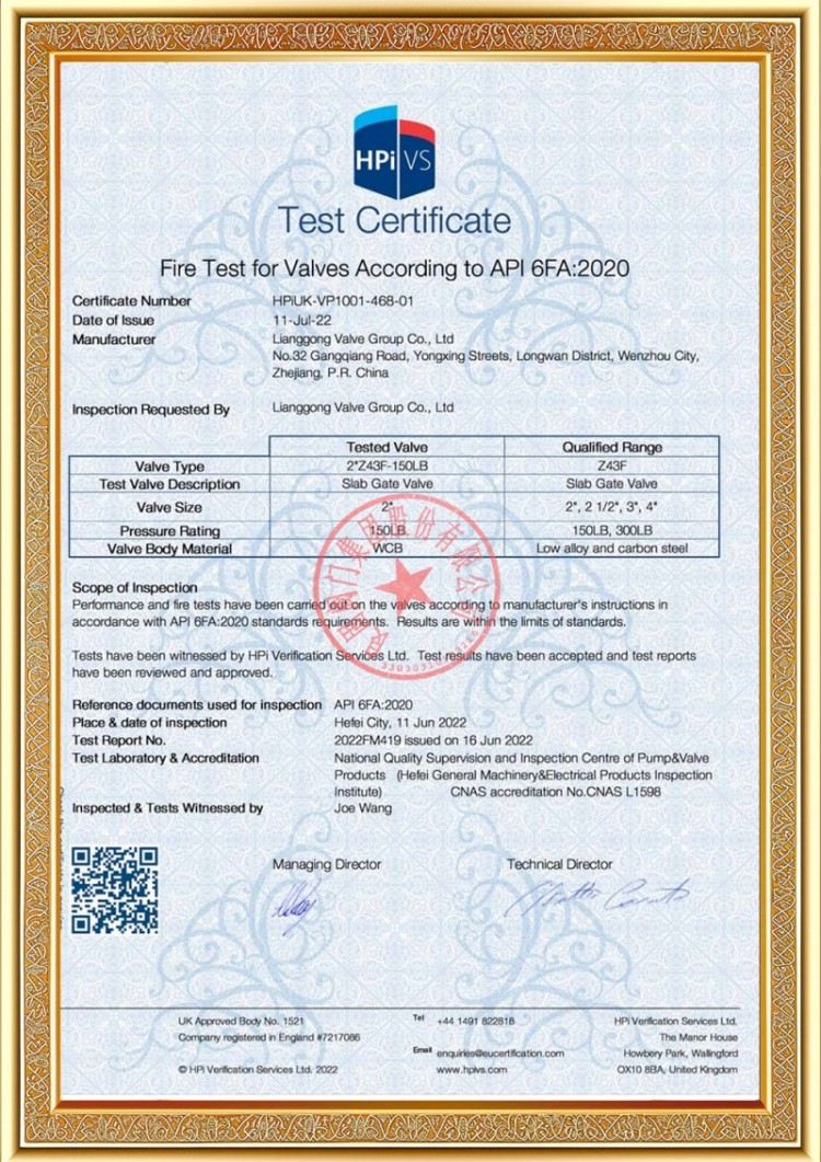 Наша компания имеет различные лицензии на производство клапанов для трубопроводов под давлением, а наша продукция прошла сертификацию системы и продукции TS A1, ISO 9001, ISO 14001, ISO 45001, API 6D, API 600, APL 609, CE/PED, API 607, API 6FA, ISO 15848-1 и EAC. У нас также есть патентные свидетельства на изобретения для различных клапанов, таких как шаровые краны, дроссельные клапаны, предохранительные клапаны и запорные клапаны.